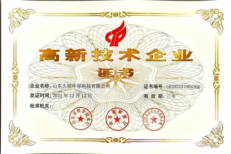山東久碩環(huán)保科技有限公司,成功申請成為高新技術(shù)企業(yè)